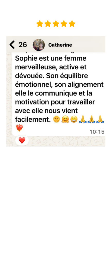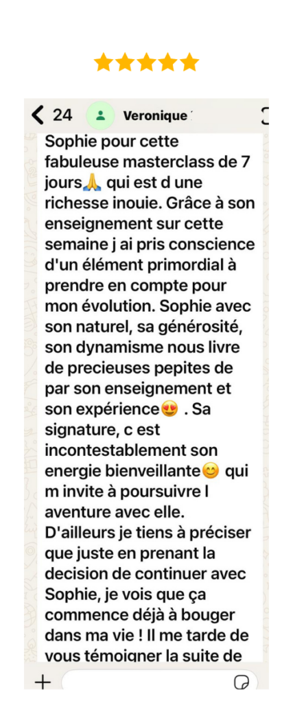 La vie de Sophie a été métamorphosée par cet enseignement et maintenant amÚne des résultats concrets et durables à ses clients et leur montre que le changement et la réalisation d'une vie pleine et belle est possible dans la libération des croyances limitantes et leur capacité à diriger leurs pensées vers les possibilités et non vers les obstacles. Elle croit qu'en harmonie avec les lois immuables de l'Univers, nous pouvons vivre une vie d'abondance, alignée et de joie.